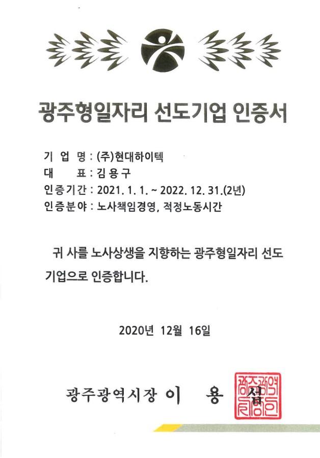 광주형일자리 선도기업 인증서