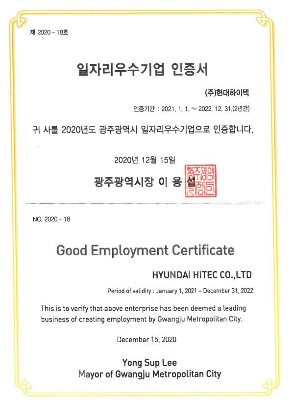 일자리우수기업 인증서