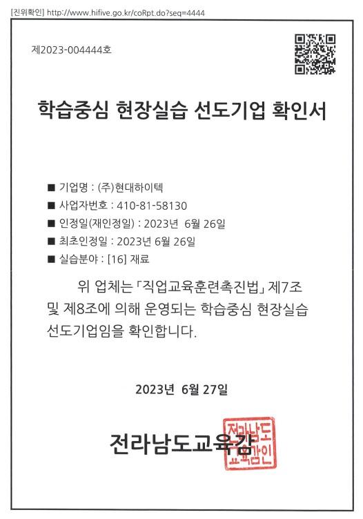학습중심 현장실습 선도기업 확인서